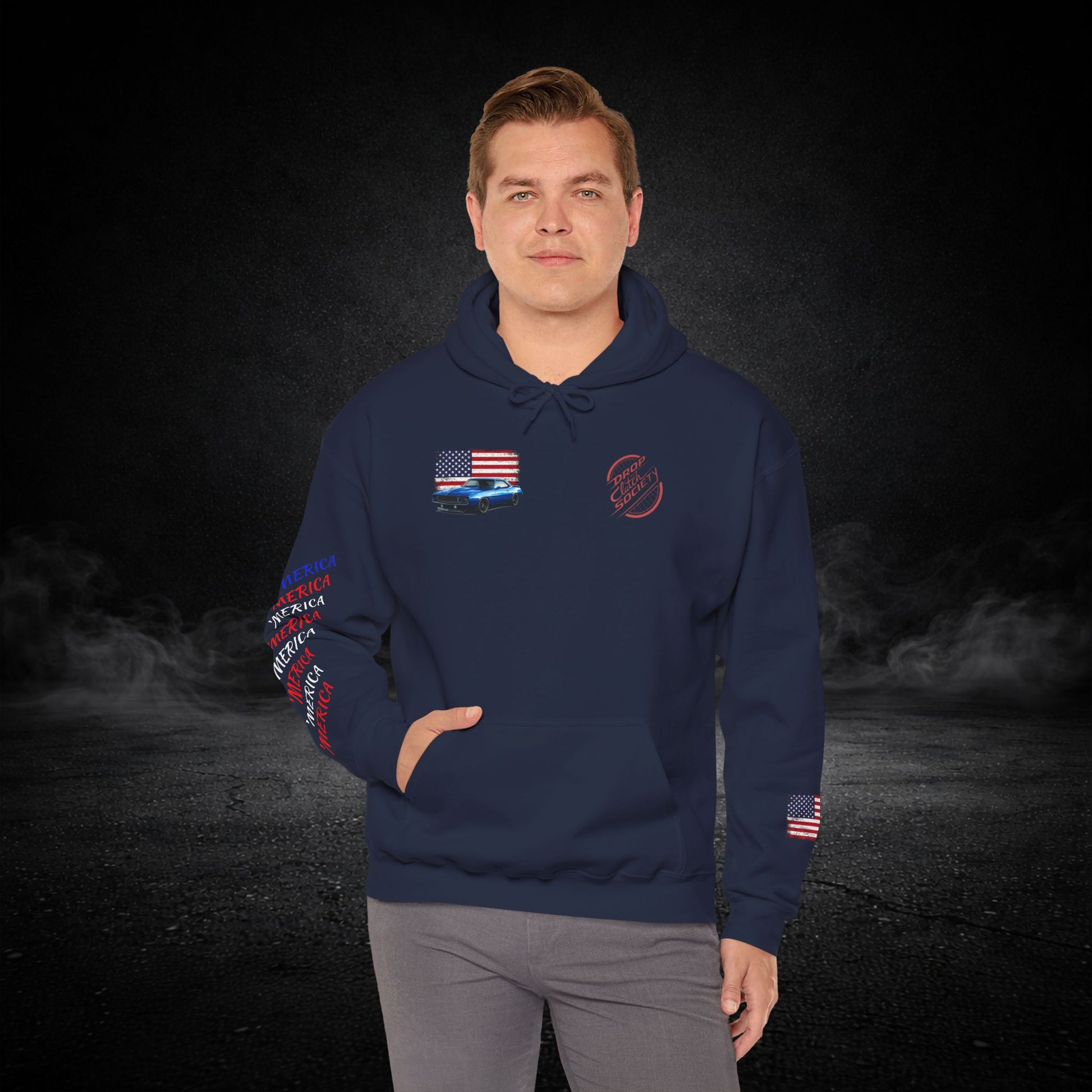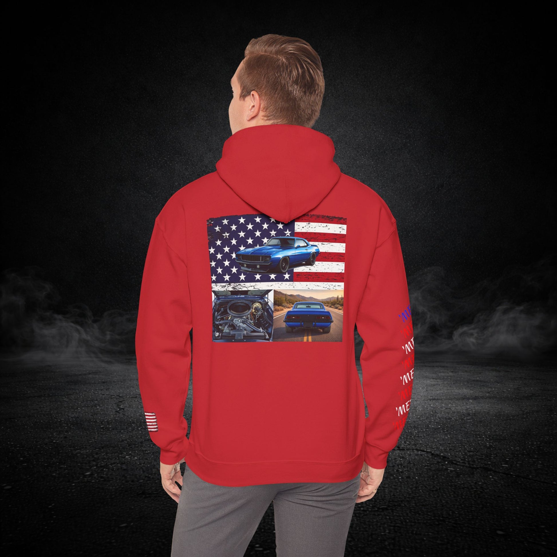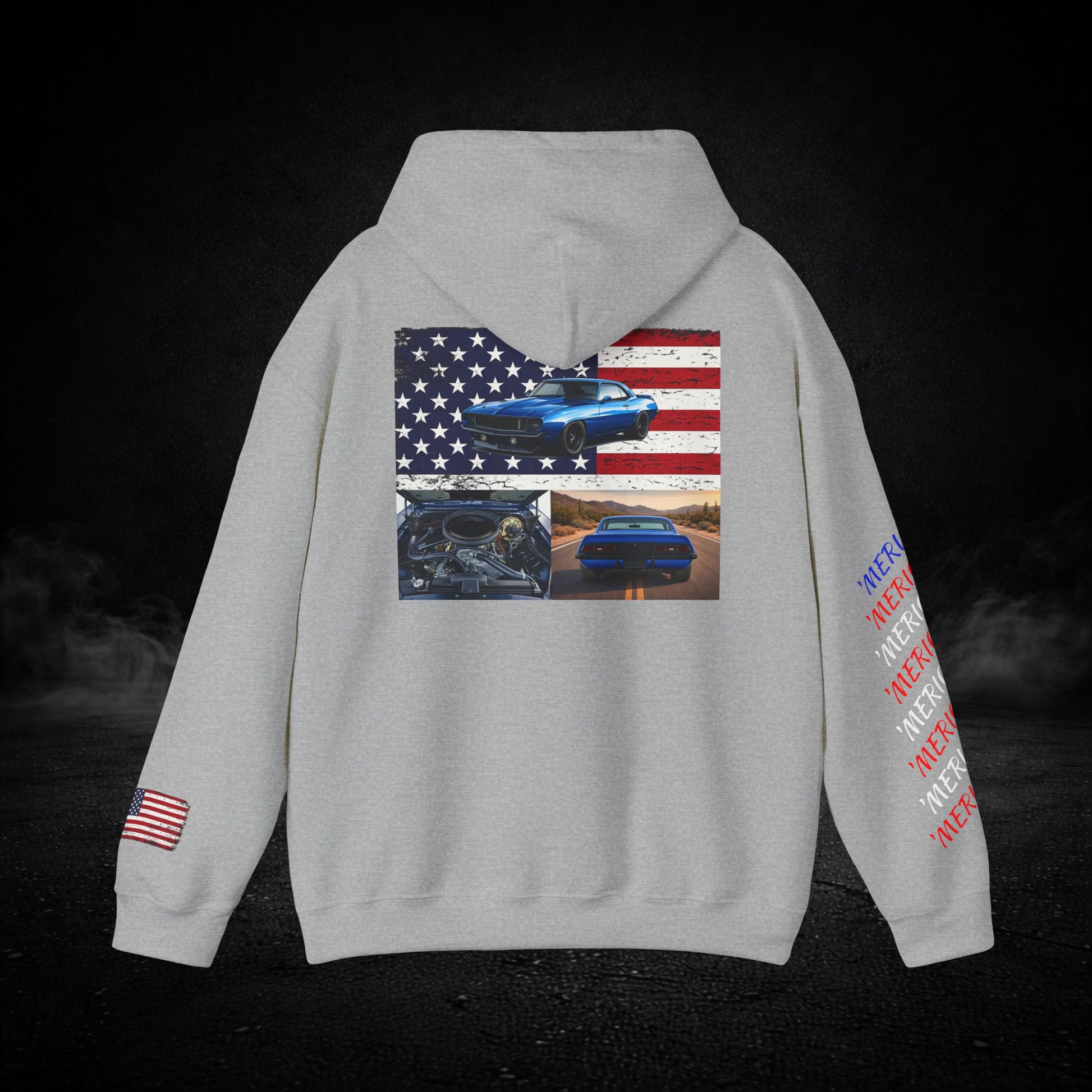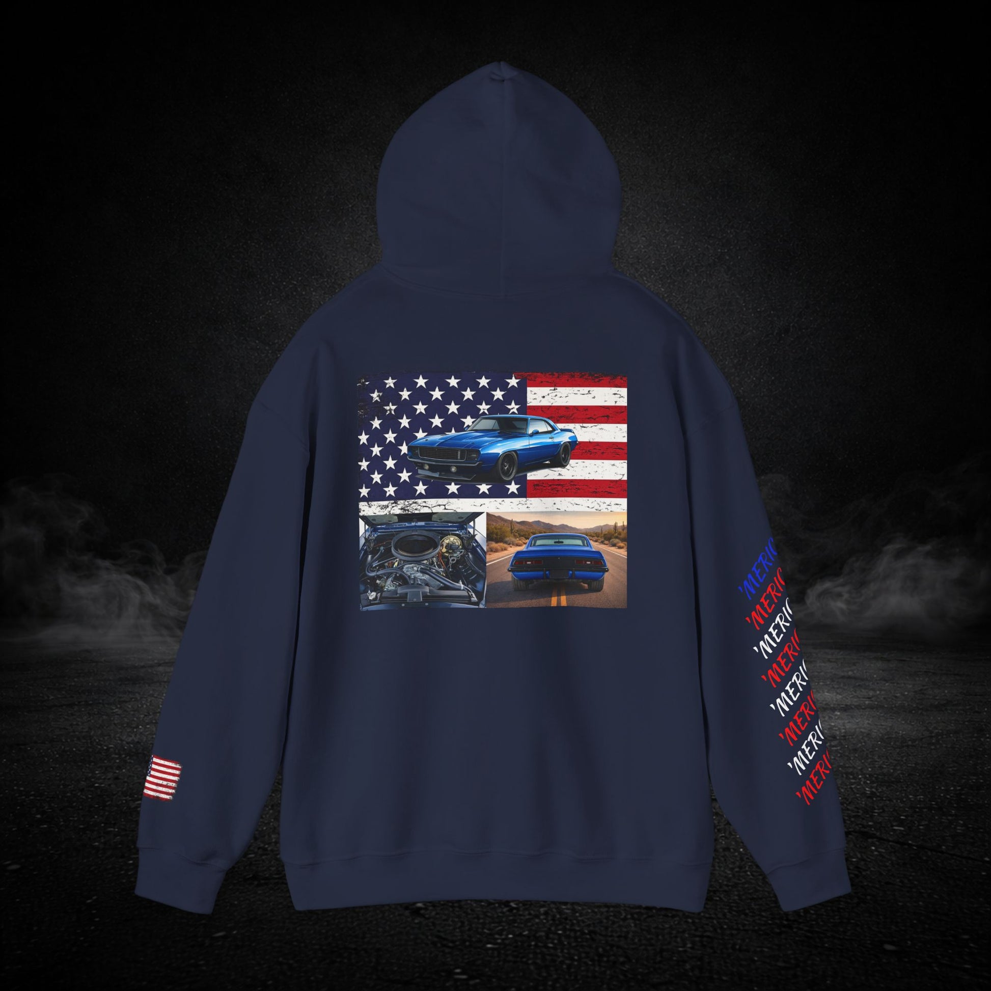This heavyweight hooded sweatshirt brings the road, the garage, and a sense of quiet pride into one cozy layer. Soft and substantial, it wears like a well-loved jacket you can count on when the sun dips and the highway cools. Subtle chest and sleeve graphics nod to American muscle — a flag, a classic car silhouette, and photographic panels on the back — so every time you shrug it on you carry a small, personal rally of memories: late-night drives, wrenching under the hood, and open-road freedom. The roomy kangaroo pocket keeps hands warm or holds small tools and tickets. The double-lined hood and color-matched drawcord feel thoughtful and durable. It’s built to be worn, washed, and lived in — the kind of sweatshirt that becomes part of your routine for runs to the parts store, weekend car meets, or laid-back evenings by the grill.