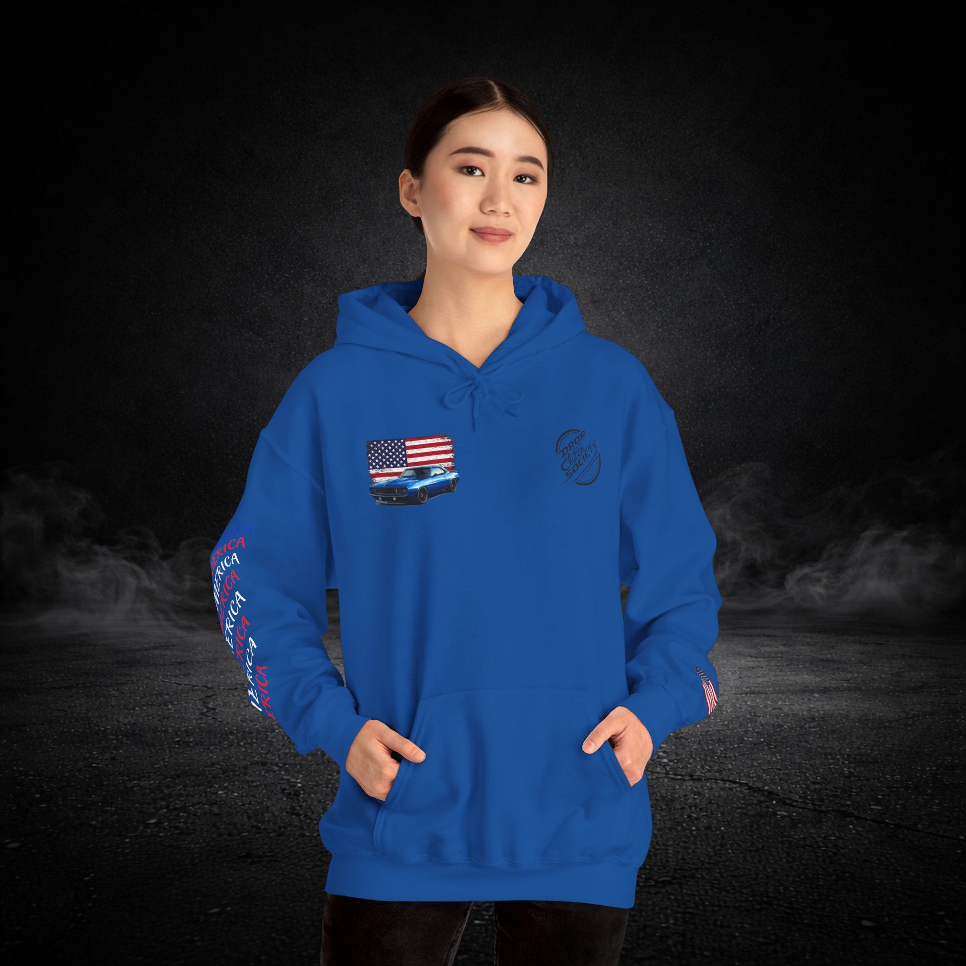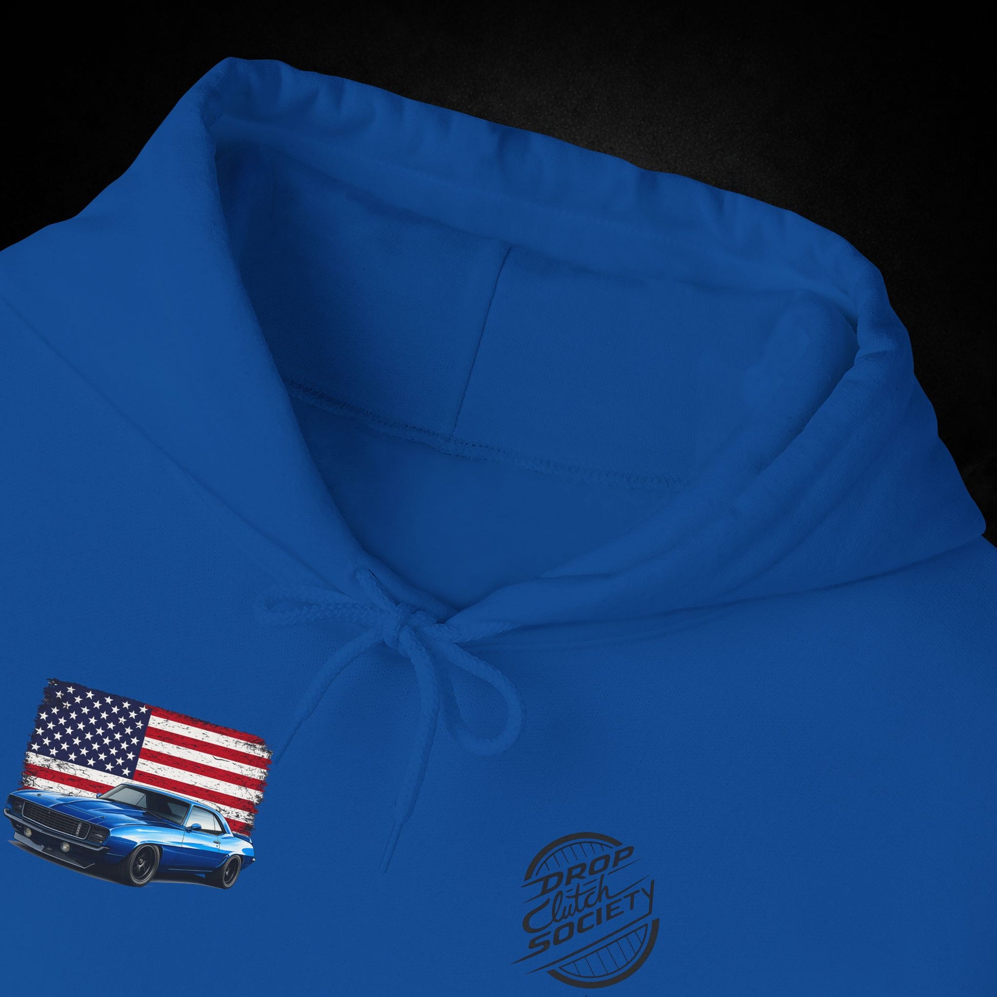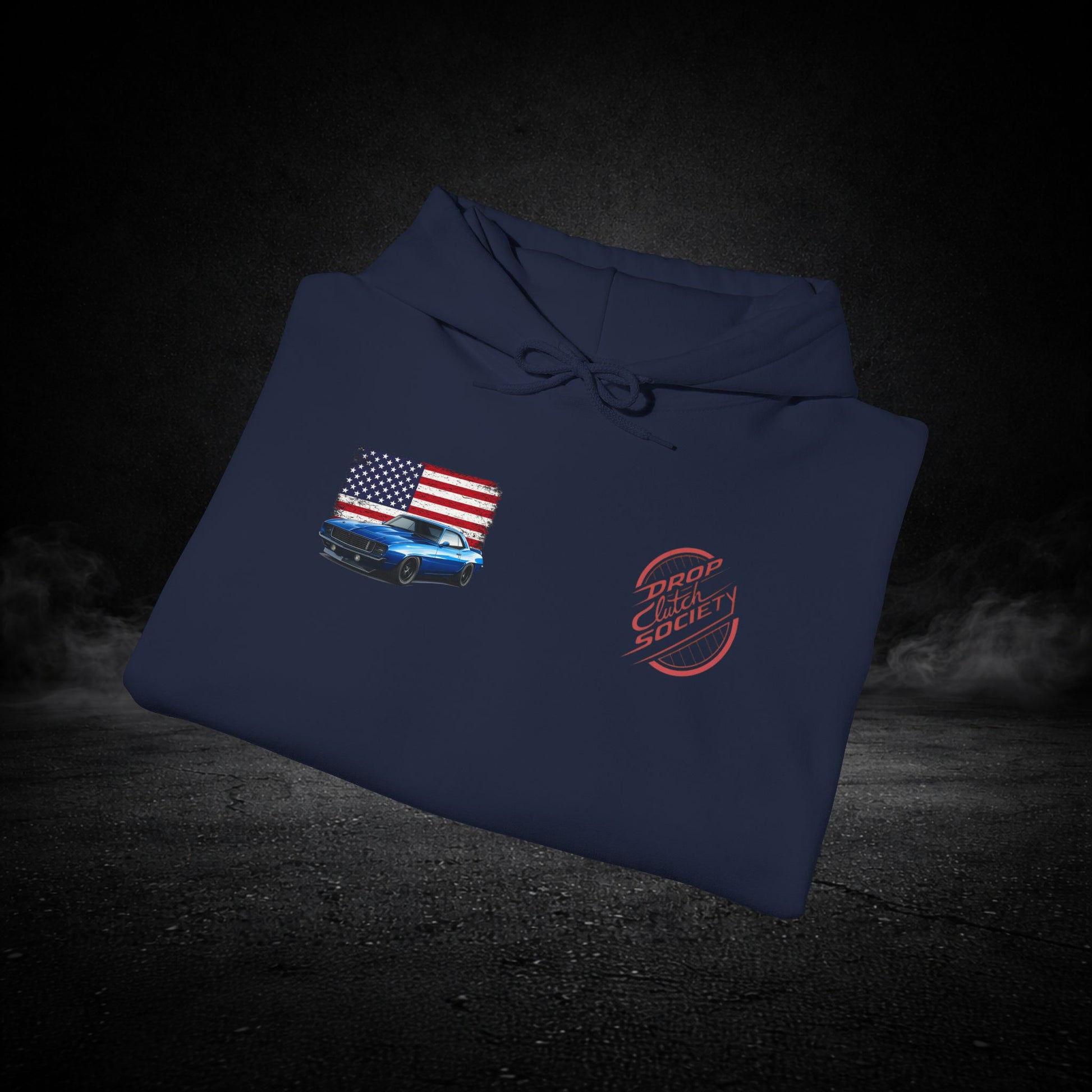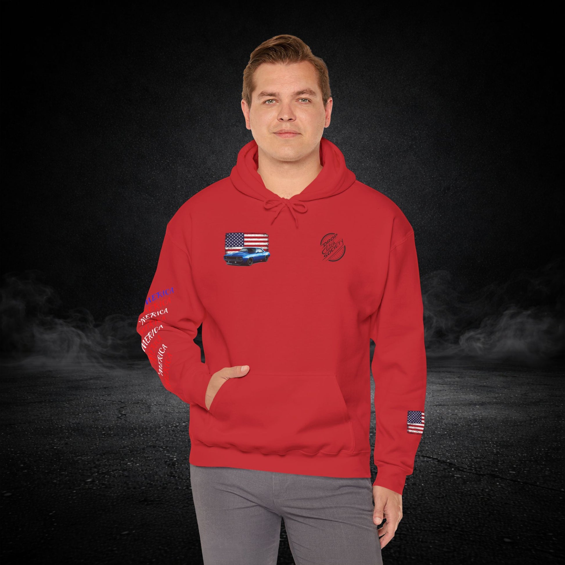 This heavyweight hooded sweatshirt brings the road, the garage, and a sense of quiet pride into one cozy layer. Soft and substantial, it wears like a well-loved jacket you can count on when the sun dips and the highway cools. Subtle chest and sleeve graphics nod to American muscle — a flag, a classic car silhouette, and photographic panels on the back — so every time you shrug it on you carry a small, personal rally of memories: late-night drives, wrenching under the hood, and open-road freedom. The roomy kangaroo pocket keeps hands warm or holds small tools and tickets. The double-lined hood and color-matched drawcord feel thoughtful and durable. It’s built to be worn, washed, and lived in — the kind of sweatshirt that becomes part of your routine for runs to the parts store, weekend car meets, or laid-back evenings by the grill.