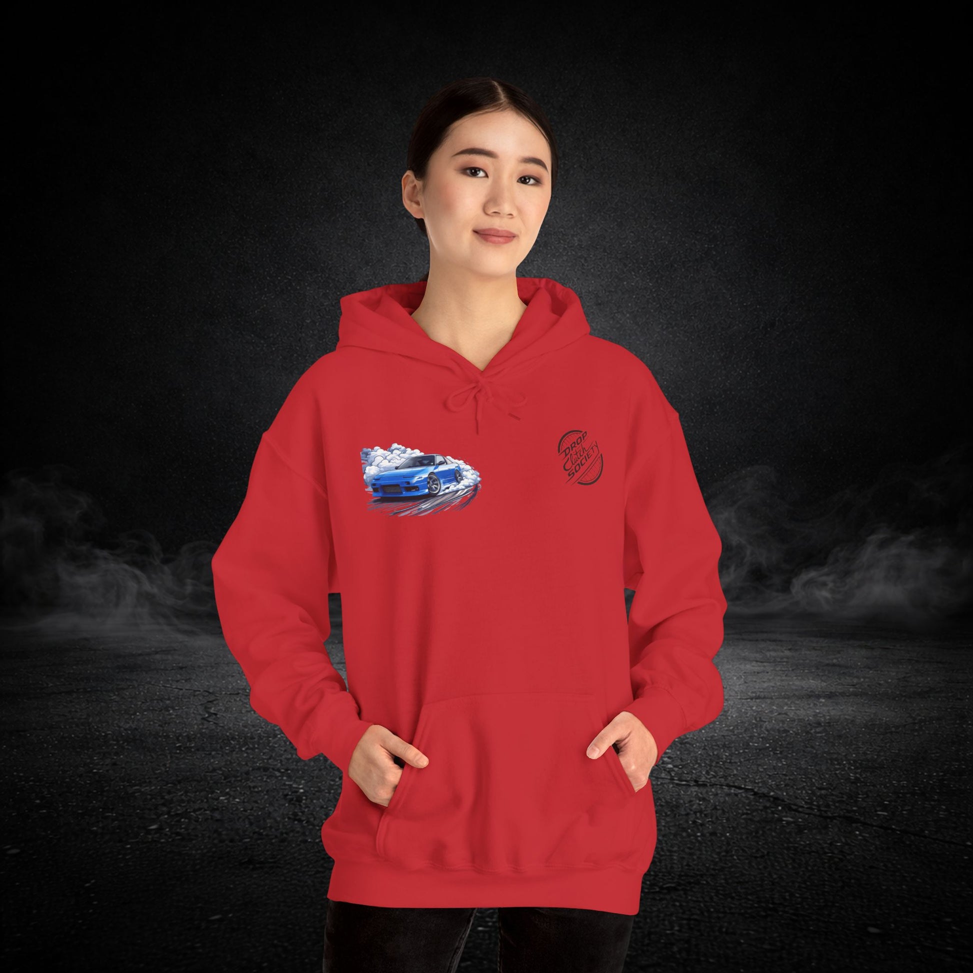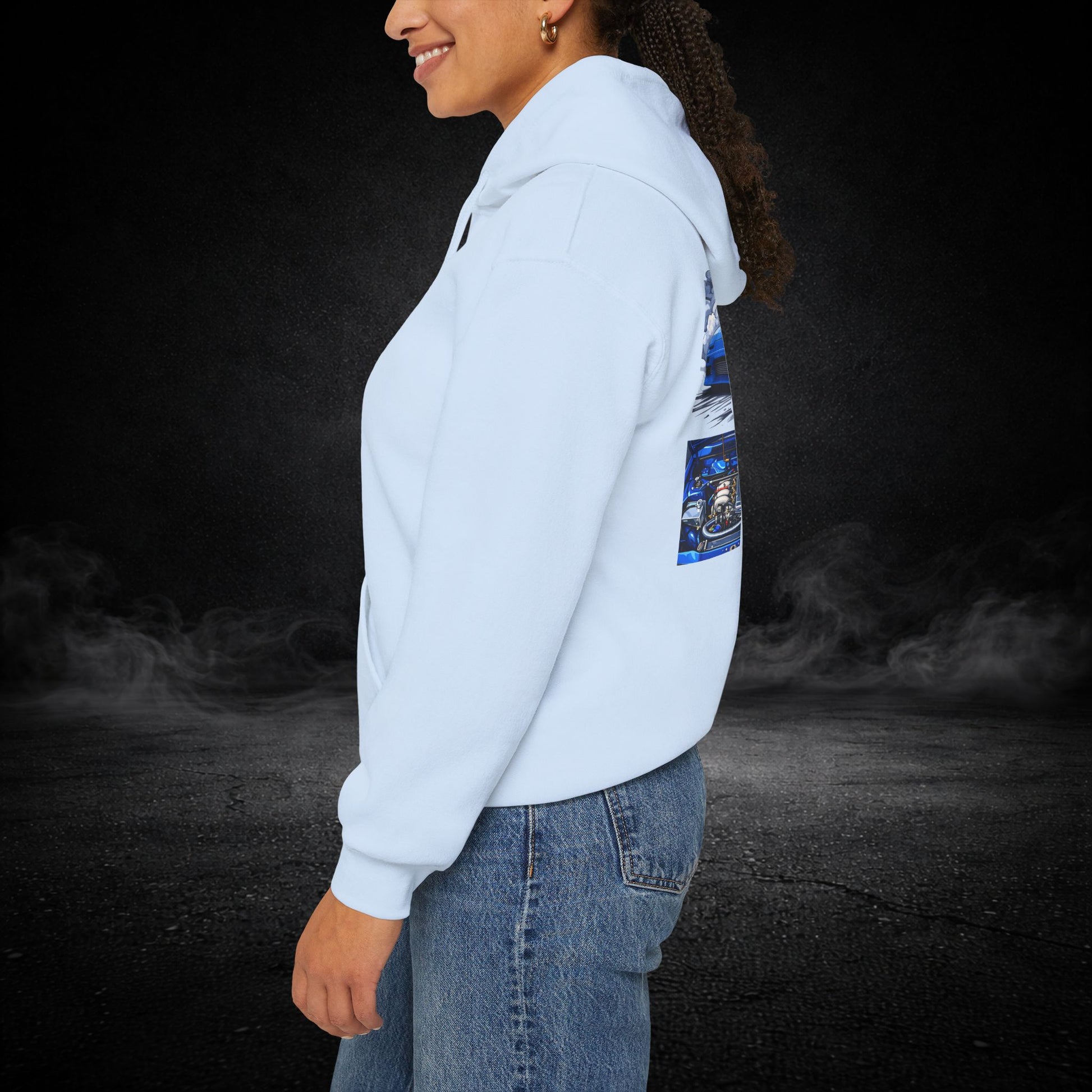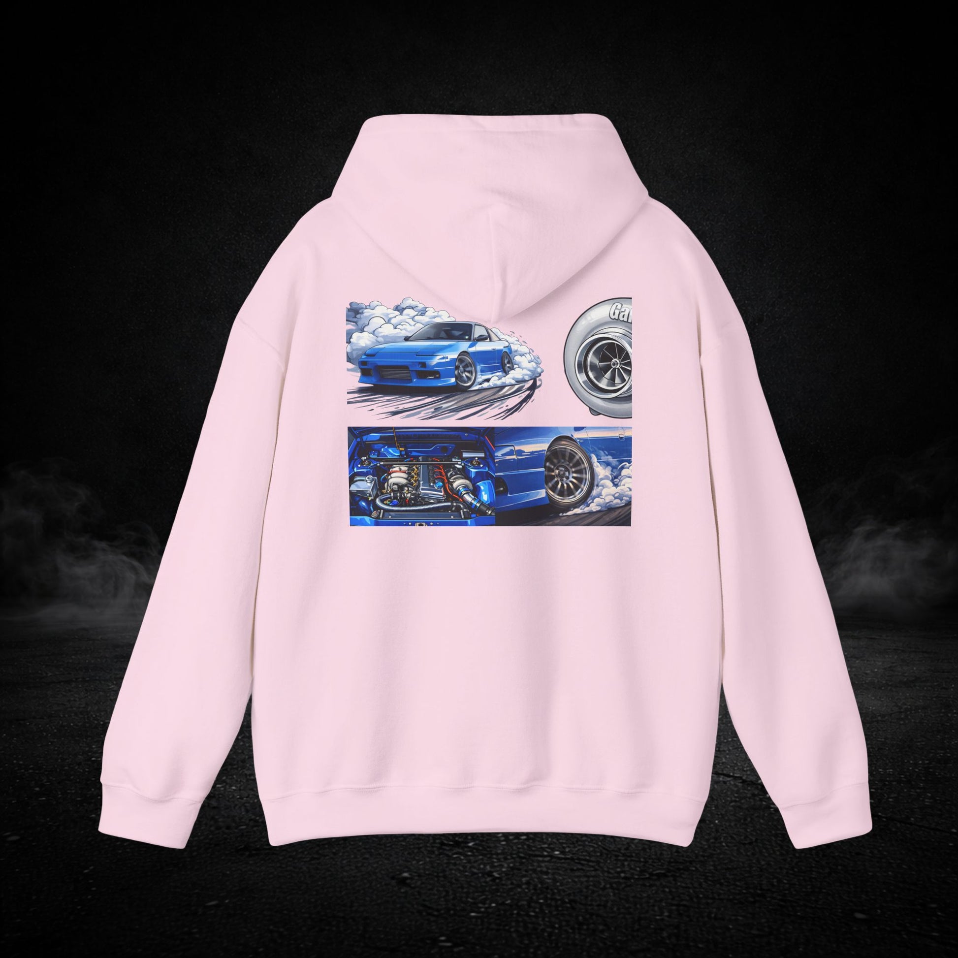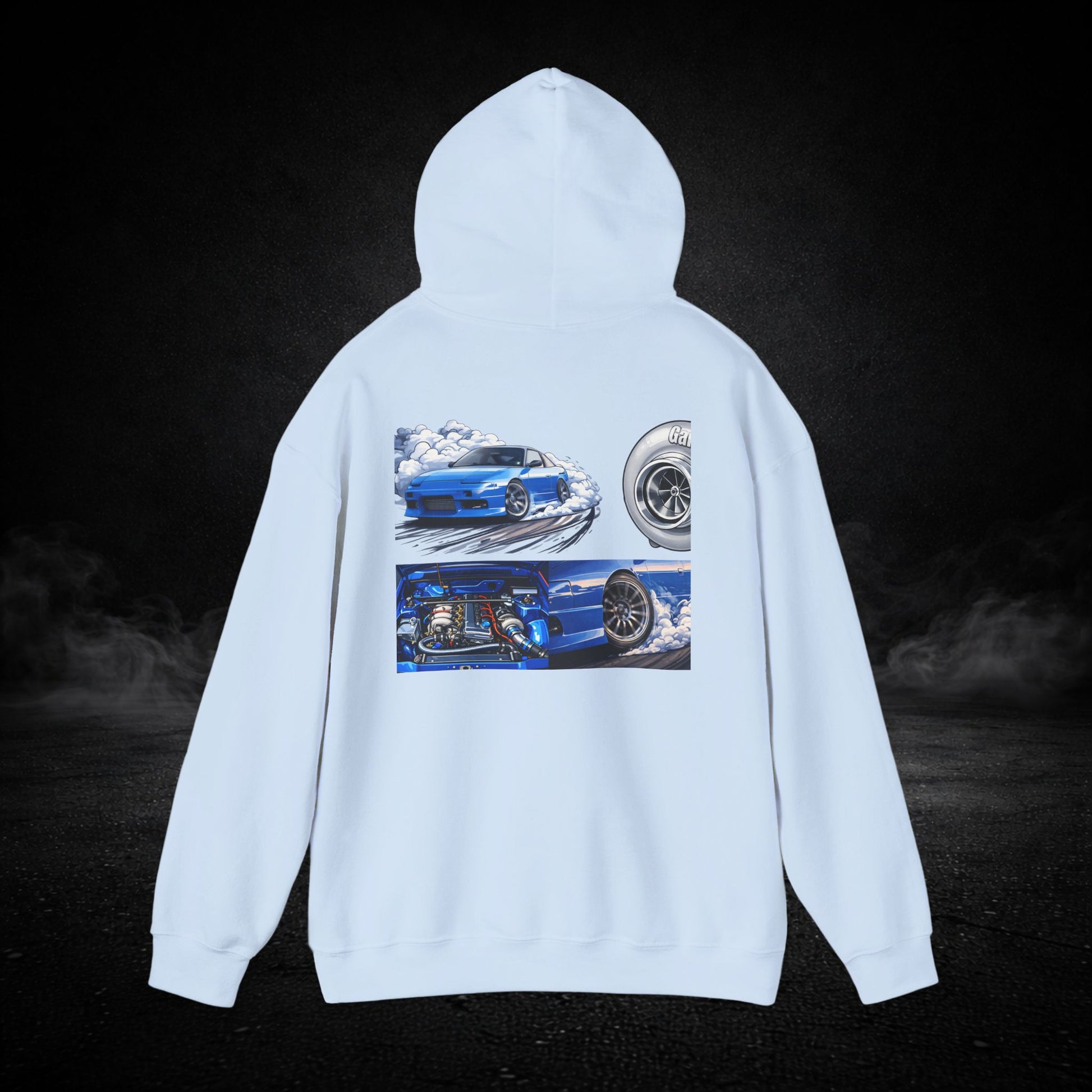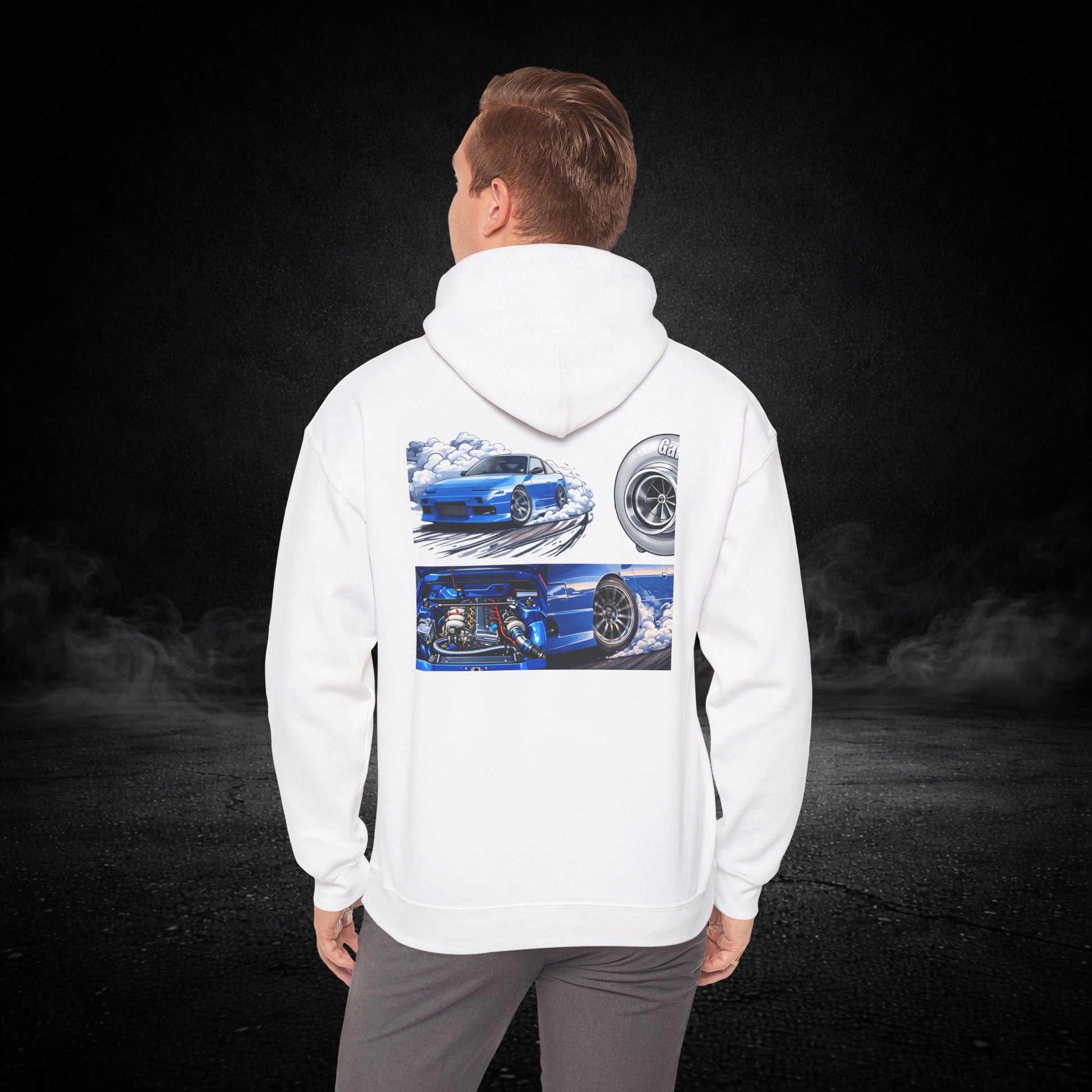 Slide into this cozy hoodie and feel the pulse of the open road. Soft, slightly heavy fabric wraps you in warmth while bold automotive artwork—slick blue drift car, spinning wheel detail, and engine close-up—turns the back into a statement piece. The front keeps things subtle with a small badge-style logo and a sketch of the car, so you can wear it to a meet, a late-night drive, or when you want to carry that racetrack energy into everyday life. The classic pouch pocket and double-lined hood add practical comfort; quality stitching and eco-conscious fibers keep it built to last. It’s for people who live for RPMs, midnight runs, and the smell of hot rubber, yet still want something they can throw on with jeans or track pants and feel instantly connected to their crew.