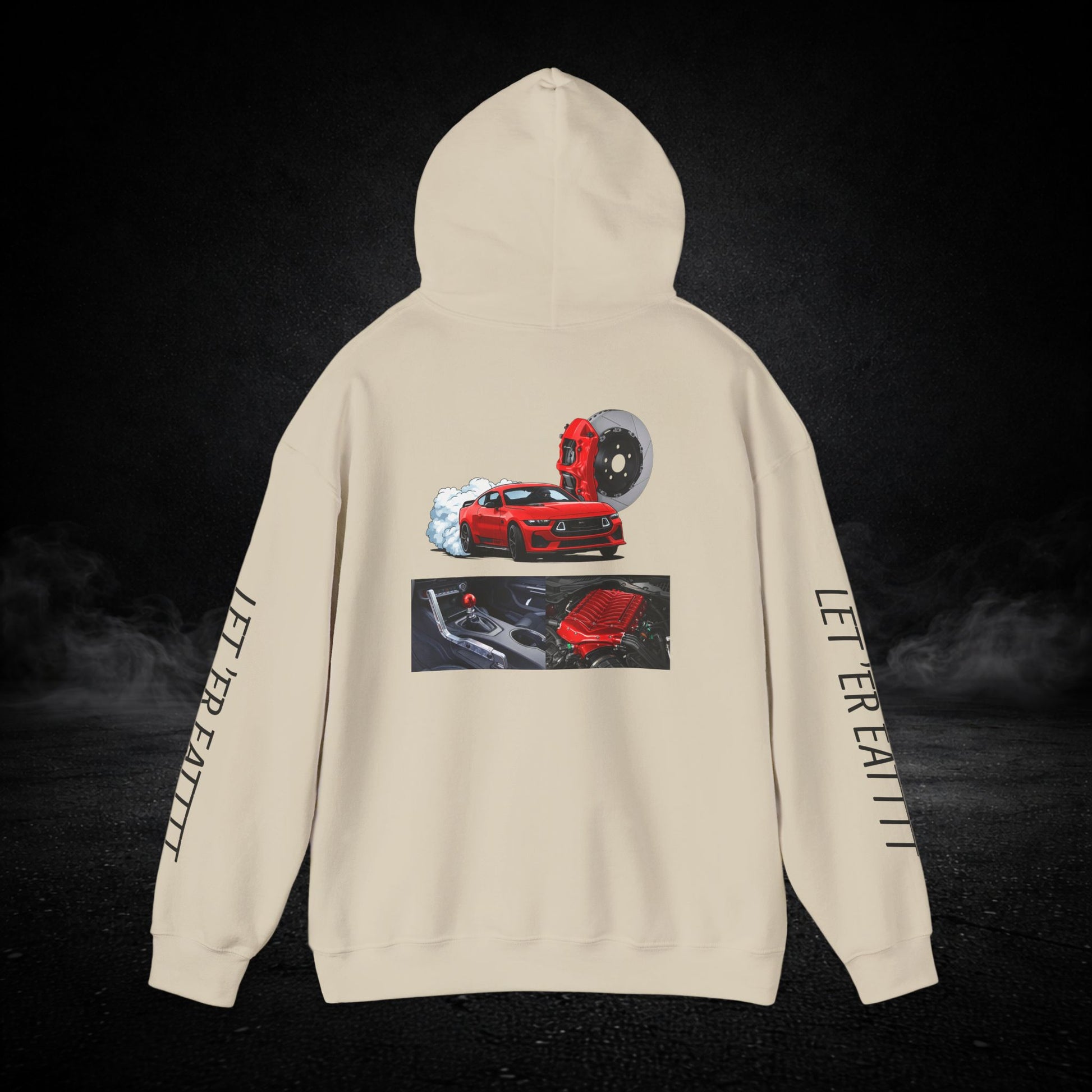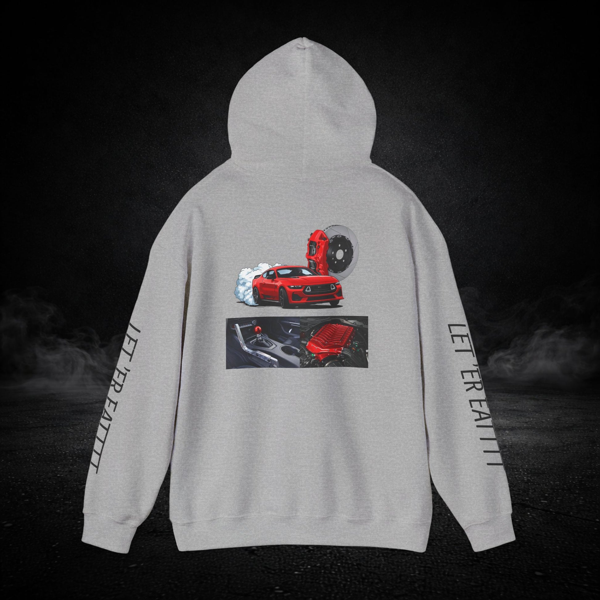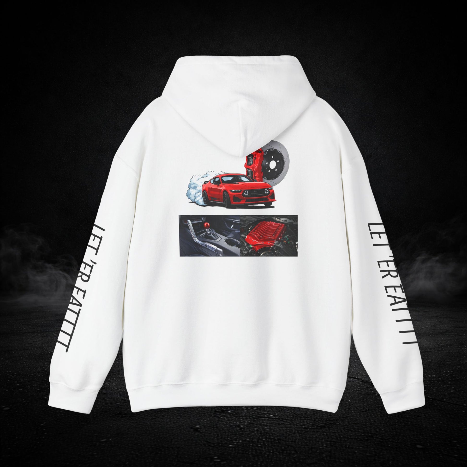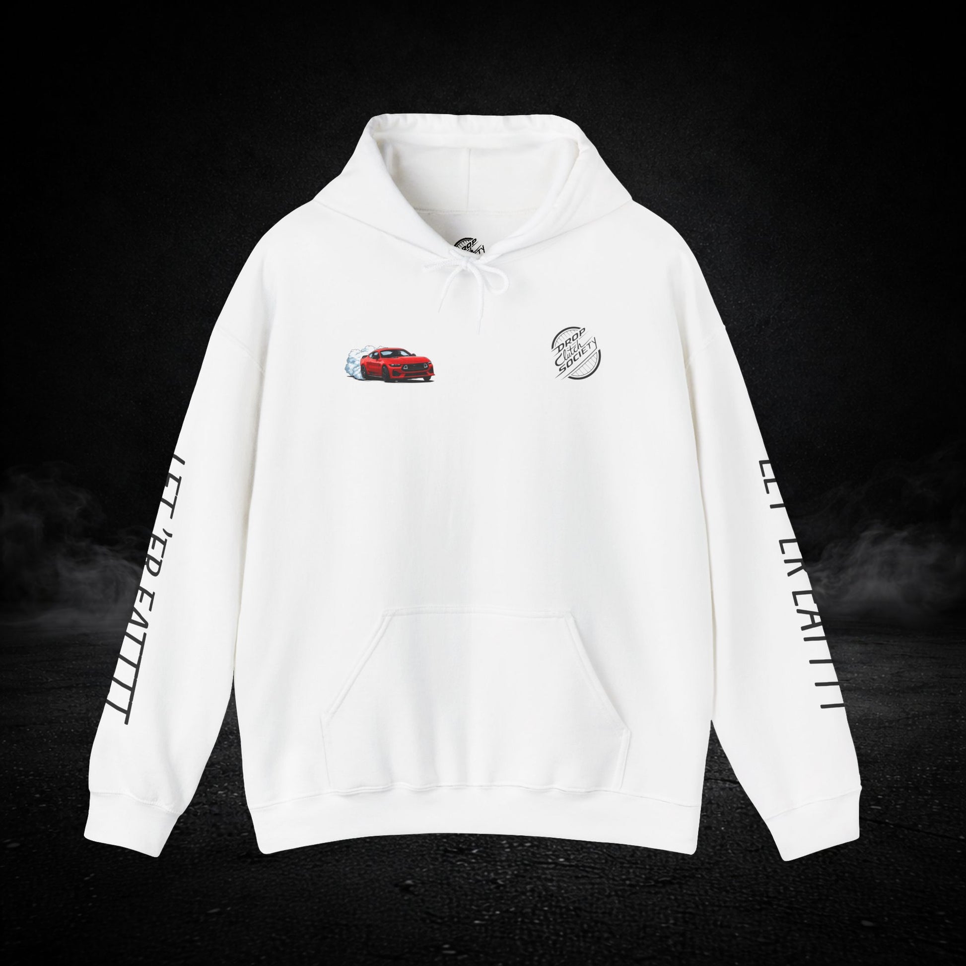 This hooded sweatshirt channels street-ready car culture with clean white fabric and crisp automotive artwork. A compact red sports car sits over the left chest while a bolder collage—wheel, cockpit, and smoke—occupies the back for a layered, workshop-to-showroom vibe. Subtle sleeve lettering runs down each arm, giving the piece a track-day energy that reads casual but intentional. Wear it to crisp morning drives, late-night garage hangs, or when you want to carry that tuned, focused feeling into everyday life.