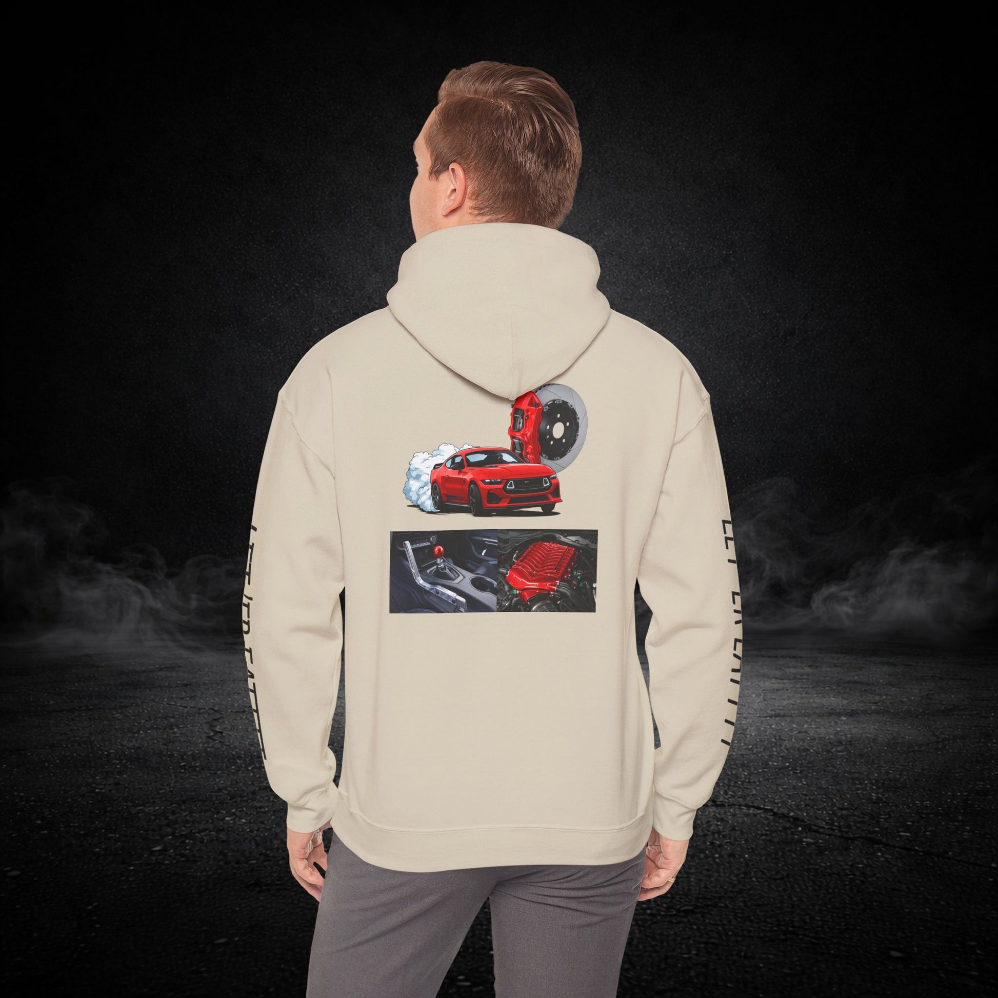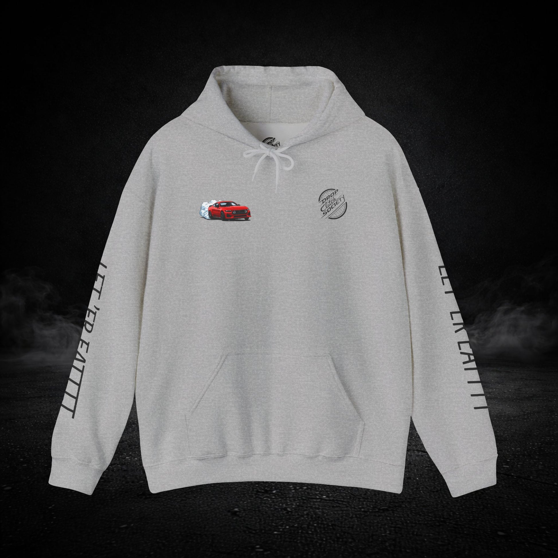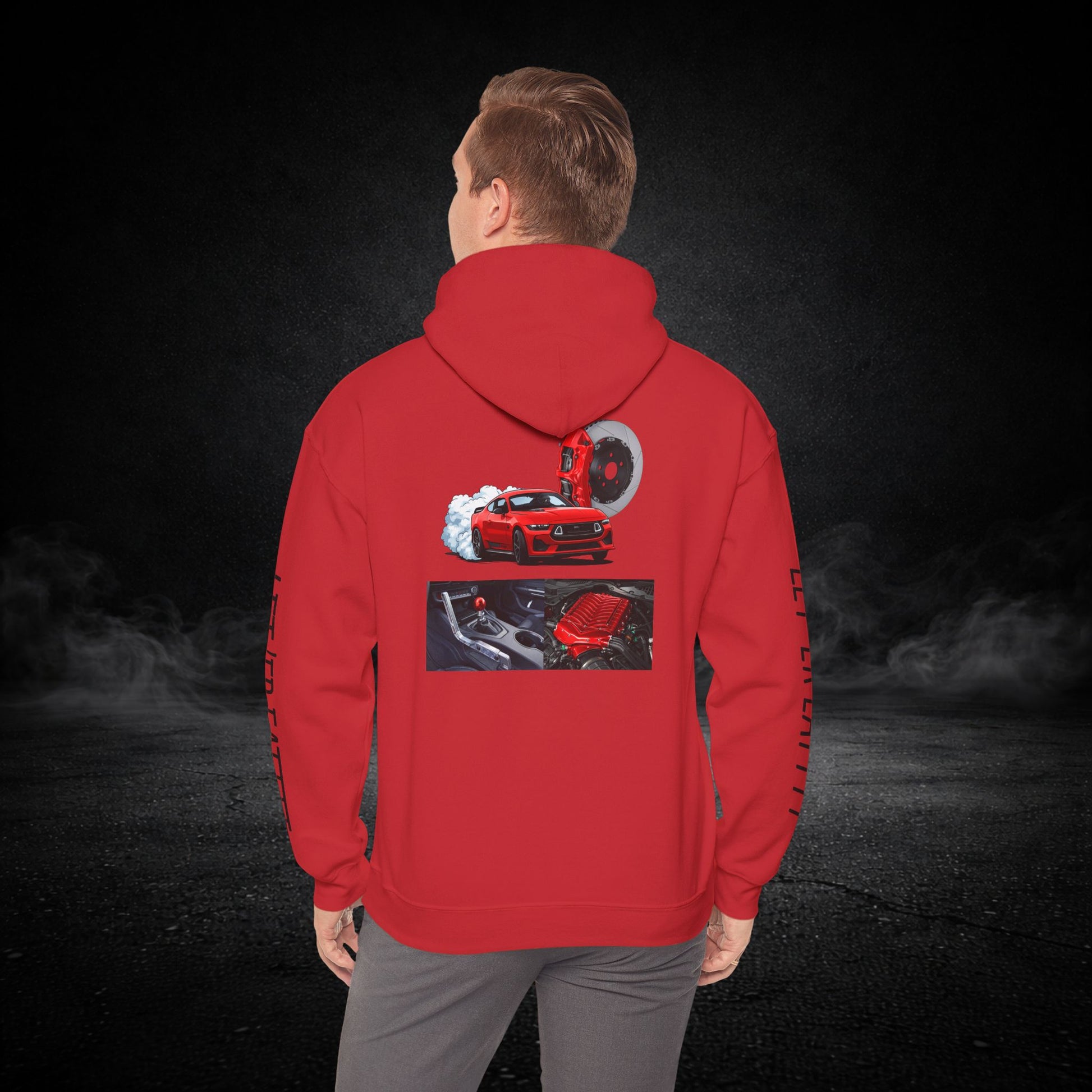 This hooded sweatshirt channels street-ready car culture with clean white fabric and crisp automotive artwork. A compact red sports car sits over the left chest while a bolder collage—wheel, cockpit, and smoke—occupies the back for a layered, workshop-to-showroom vibe. Subtle sleeve lettering runs down each arm, giving the piece a track-day energy that reads casual but intentional. Wear it to crisp morning drives, late-night garage hangs, or when you want to carry that tuned, focused feeling into everyday life.