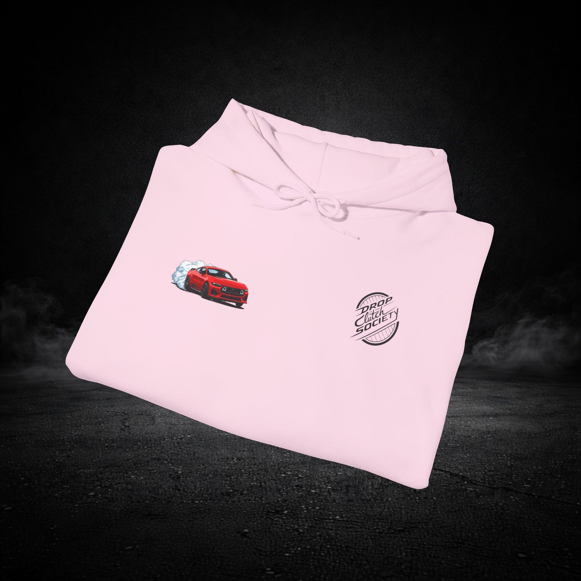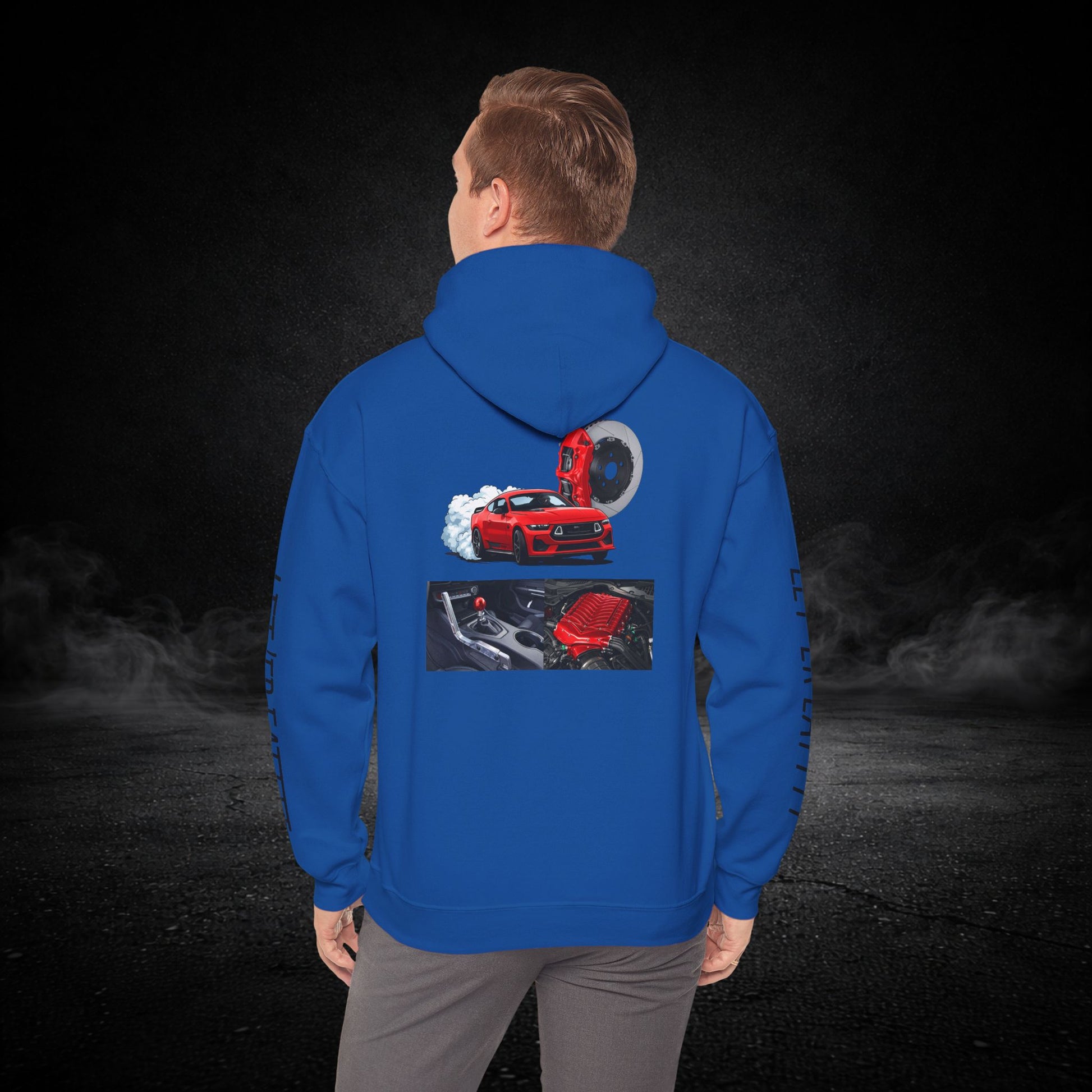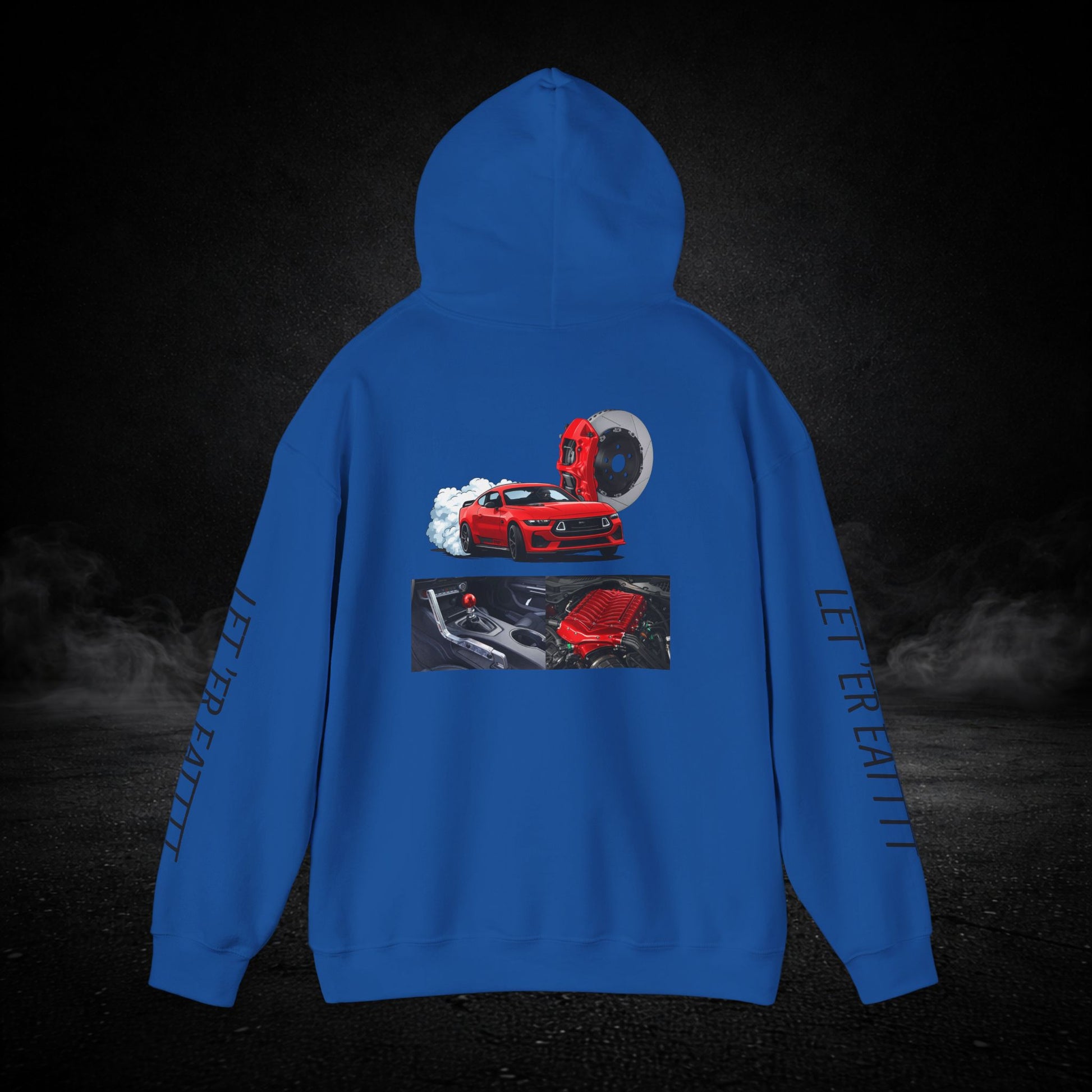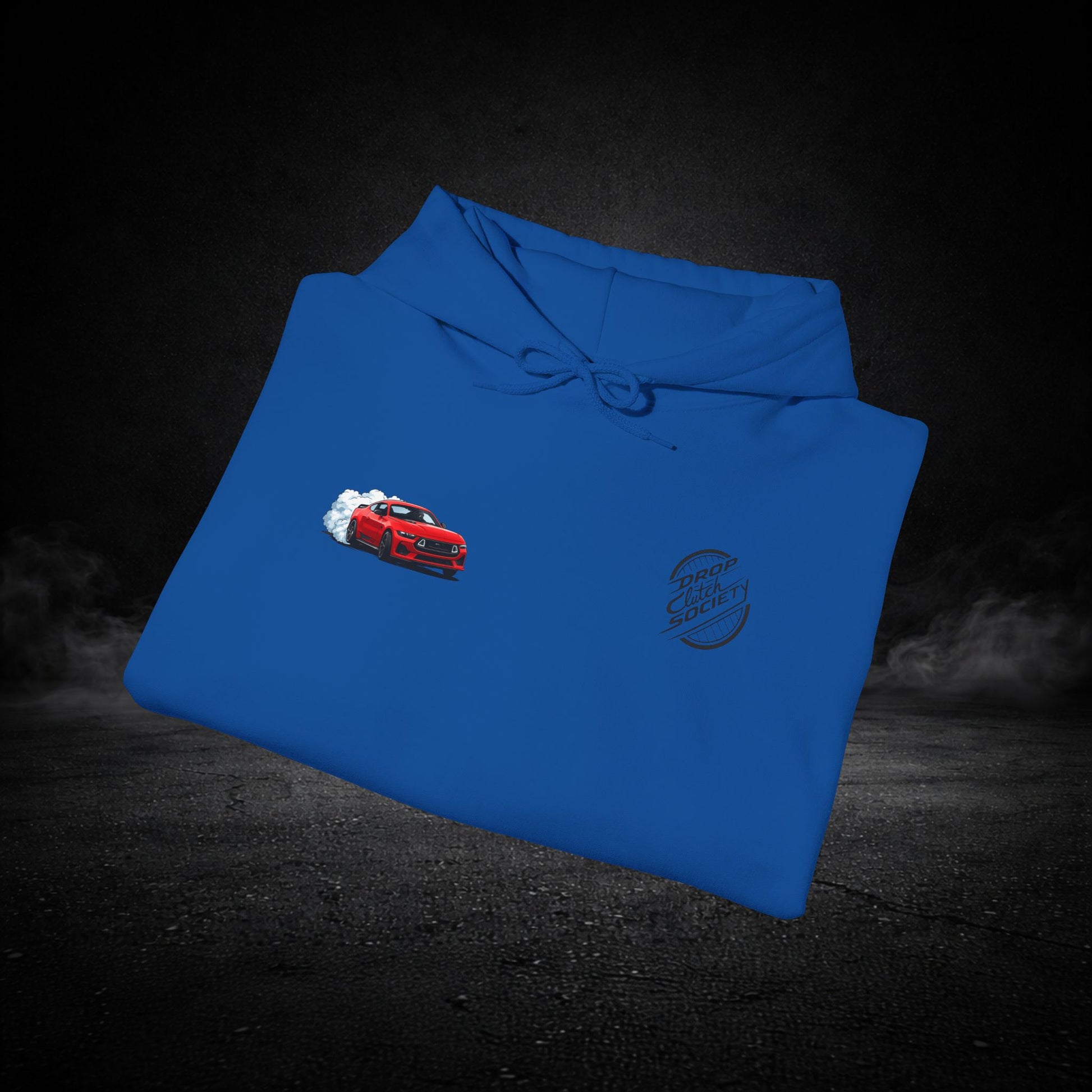 This hooded sweatshirt channels street-ready car culture with clean white fabric and crisp automotive artwork. A compact red sports car sits over the left chest while a bolder collage—wheel, cockpit, and smoke—occupies the back for a layered, workshop-to-showroom vibe. Subtle sleeve lettering runs down each arm, giving the piece a track-day energy that reads casual but intentional. Wear it to crisp morning drives, late-night garage hangs, or when you want to carry that tuned, focused feeling into everyday life.