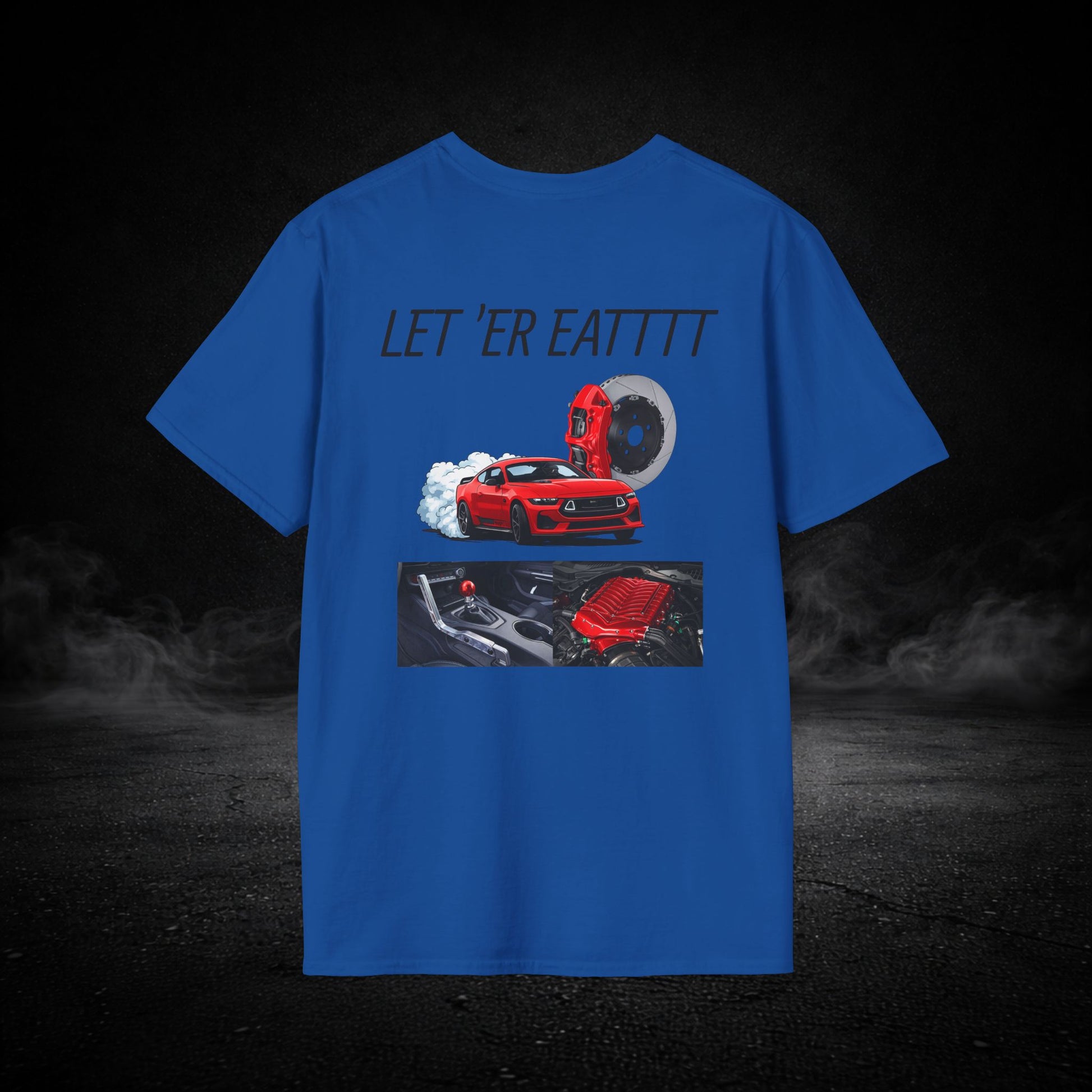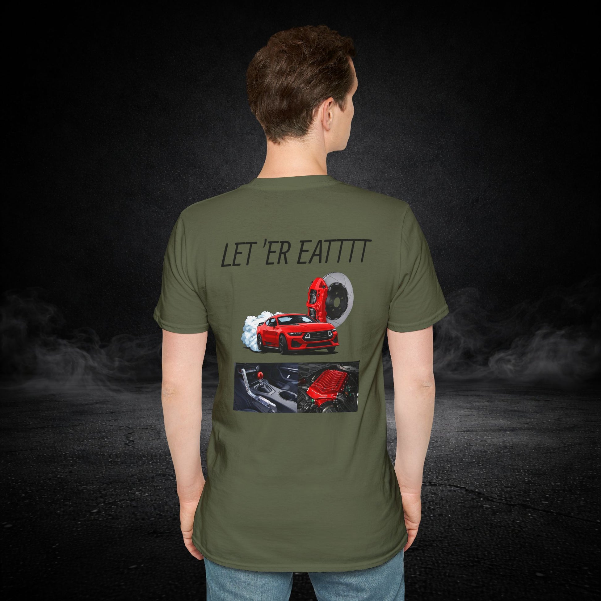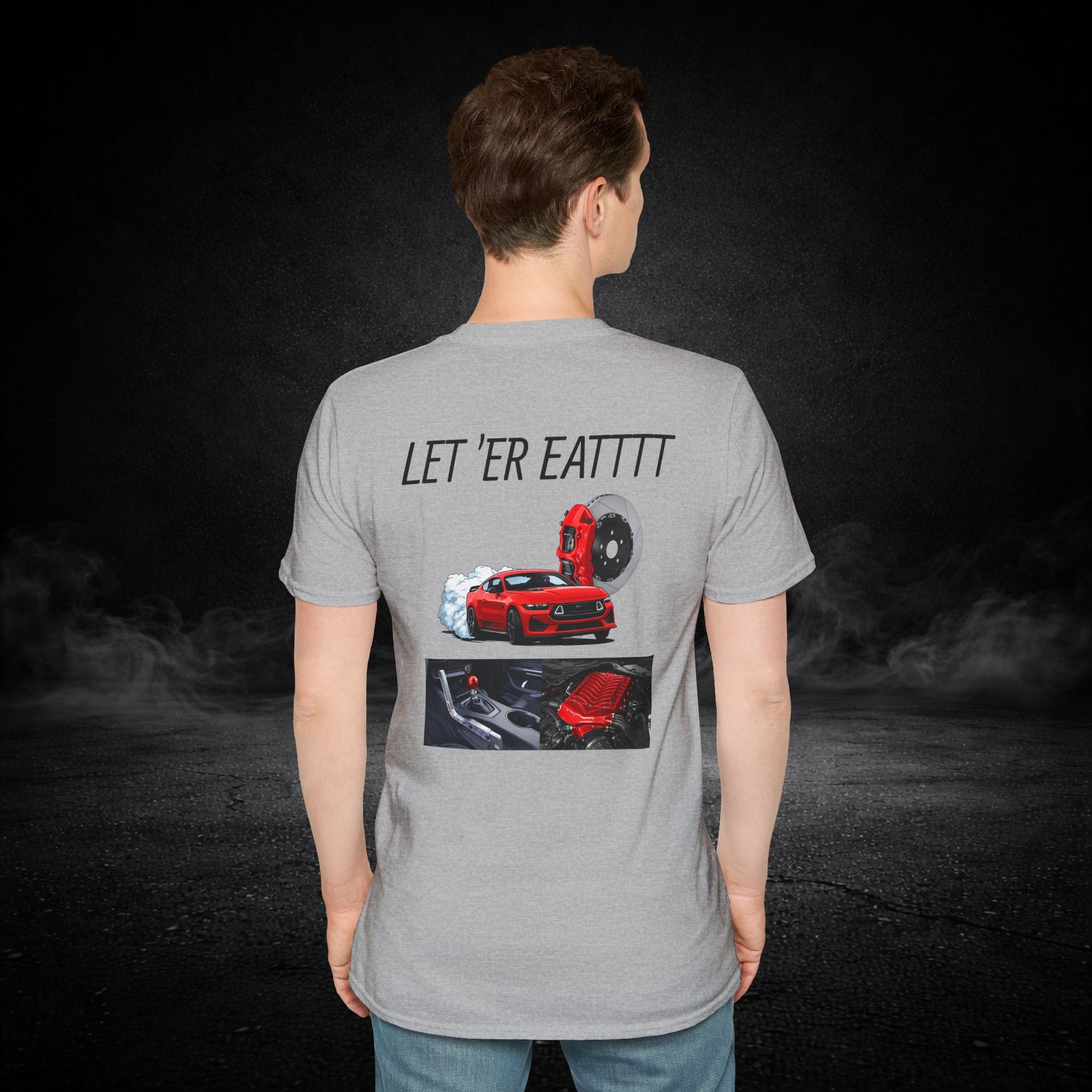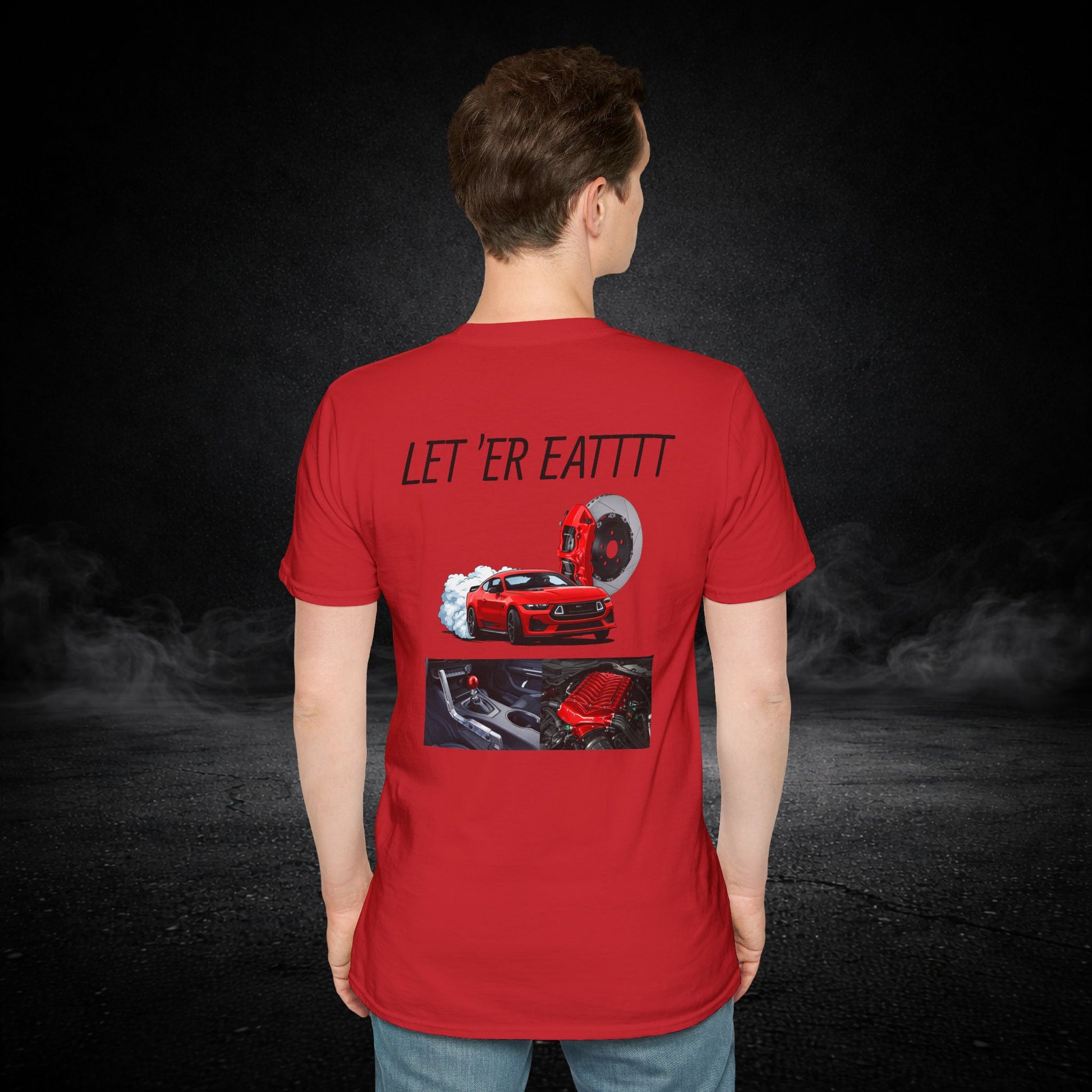 A clean, lightweight tee that speaks to people who live for open roads and wrench-time. The front wears a subtle red sports car crest and a small script badge, while the back erupts with bold automotive imagery — brake rotor, turbo blur, cockpit shot — and the cheeky “LET ’ER EATTTT” headline. It’s the sort of shirt you pull on for track days, late-night meetups, or garage nights with friends. Breathable ring-spun cotton keeps it comfortable while high-detail DTG/DTF printing preserves the sharp reds and mechanical textures. Wear it with a worn denim jacket or under a mechanic’s coverall; it reads like a statement from someone who loves speed and the craft behind it.