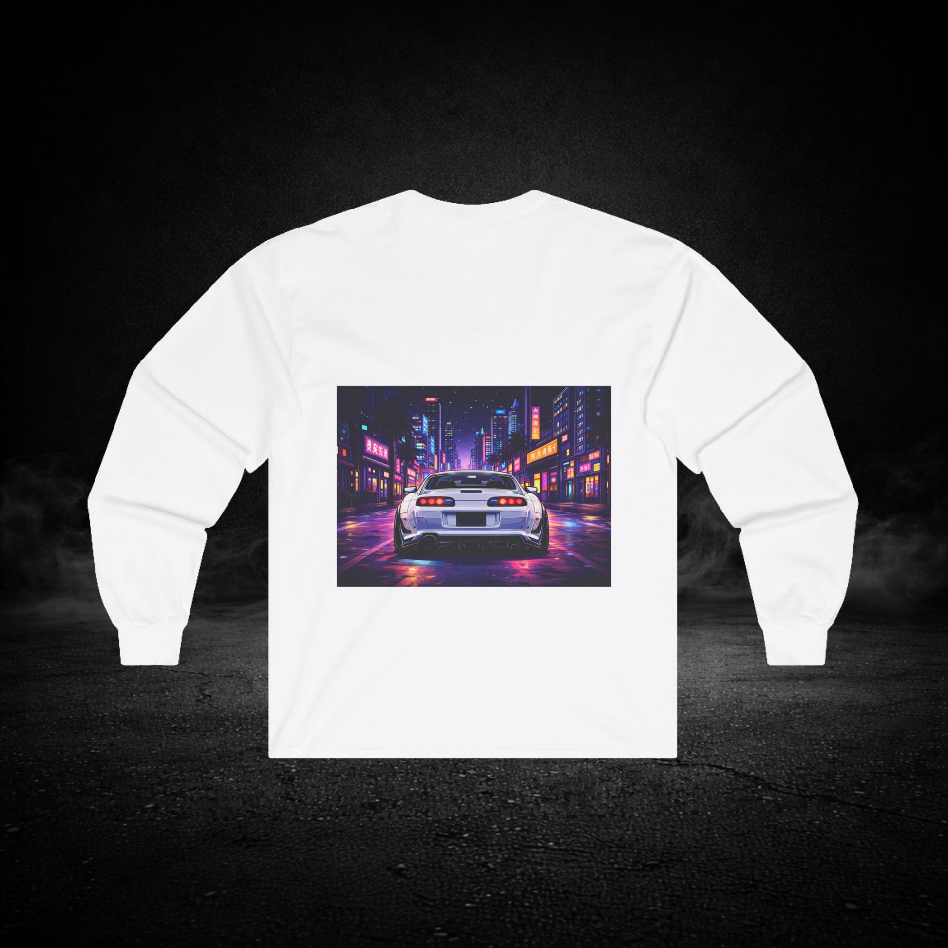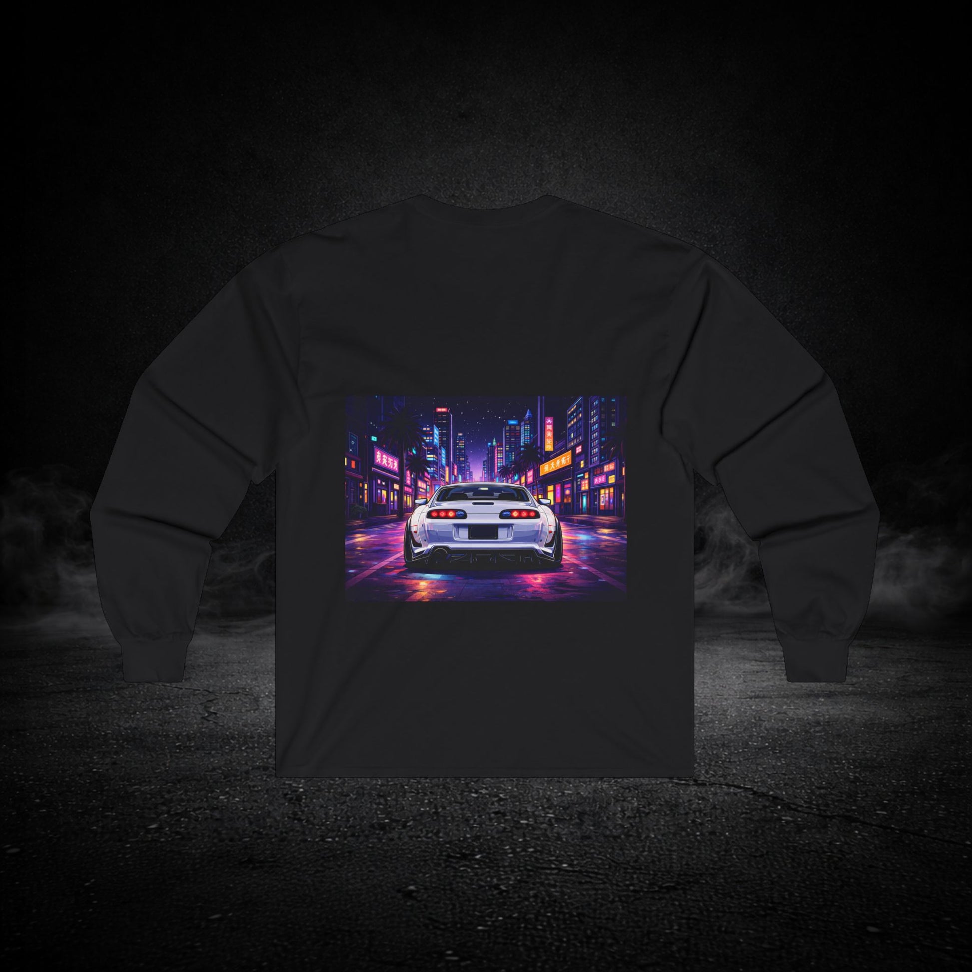 This long-sleeve tee brings neon-soaked street nights to your everyday wardrobe. A bold, cinematic car print sits center front and back, the kind of image that sparks stories about midnight drives, rain-slicked asphalt and city lights humming overhead. The thicker, vintage-feel cotton drapes with weight and presence while the classic fit and ribbed collar hold their shape through repeat wears. Wear it layered under a jacket or on its own when you want to channel a late-night ride — subtle engineering details like shoulder tape and a tubular knit reduce stretch and keep the silhouette clean.